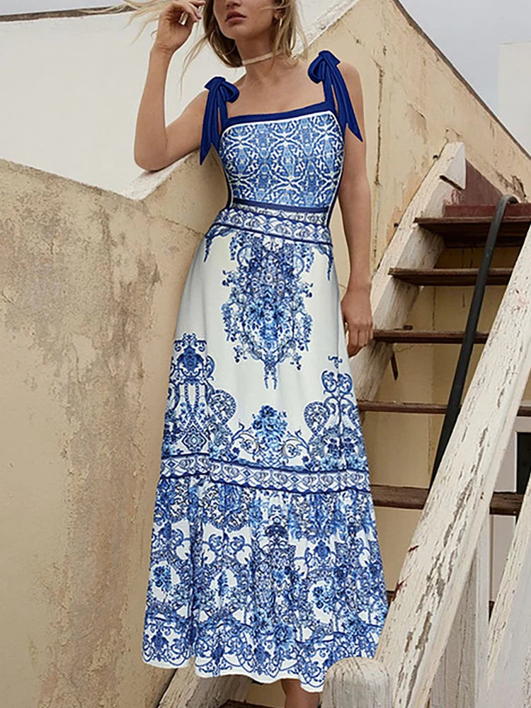 Adjustable bow tie straps provide personalized support blue ethnic print adds a laid-back bohemian flair form-fitting stretch fabric offers comfort and flexibility carefully cut silhouette enhances natural curves.