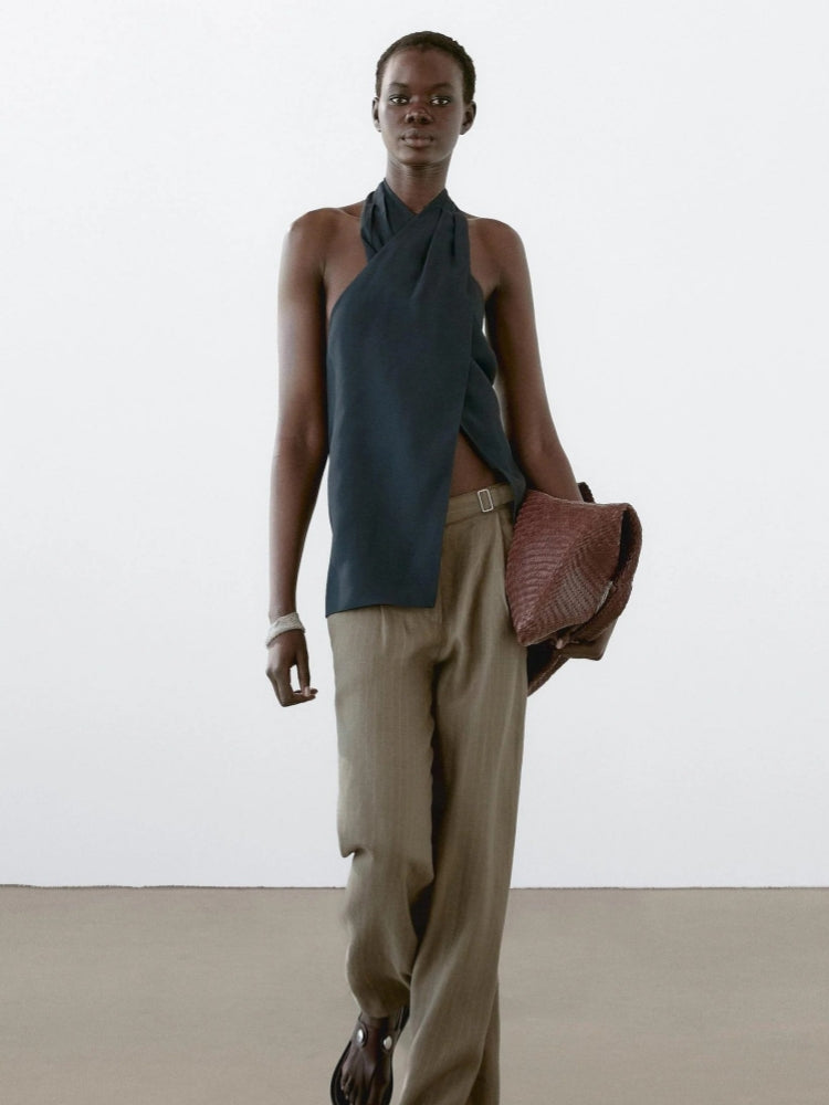 Effortlessly modern with a hint of retro flair. the Halter Neck Back Neckline Top in blue is your new go-to for chic summer styling. Crafted from a breathable blend of 74% viscose and 26% linen. it features a unique crossover front placket that adds depth and structure to the silhouette. The halter neckline ties at the back. showcasing the shoulders with an elegant. airy finish.