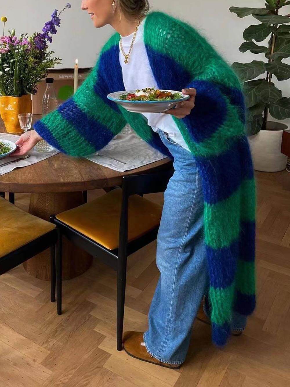 Stay stylish and comfortable in our lazy contrast stripe sweater long coat.