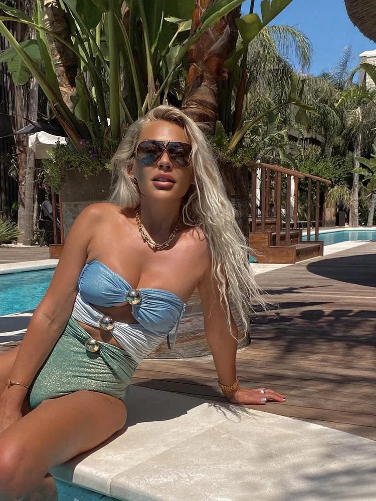 Elegant and modern. this Morandi-toned green colorblock swimsuit set brings subtle sophistication to your swimwear collection. With a high-waist design and soft muted hues. it's perfect for the refined beach lover.
