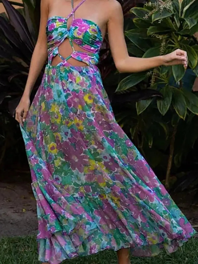 Striking purple artistic print with contour-enhancing cutouts includes two styles: ruched halter and sleek spaghetti strap version soft high-stretch fabric for a smooth. supportive fit.