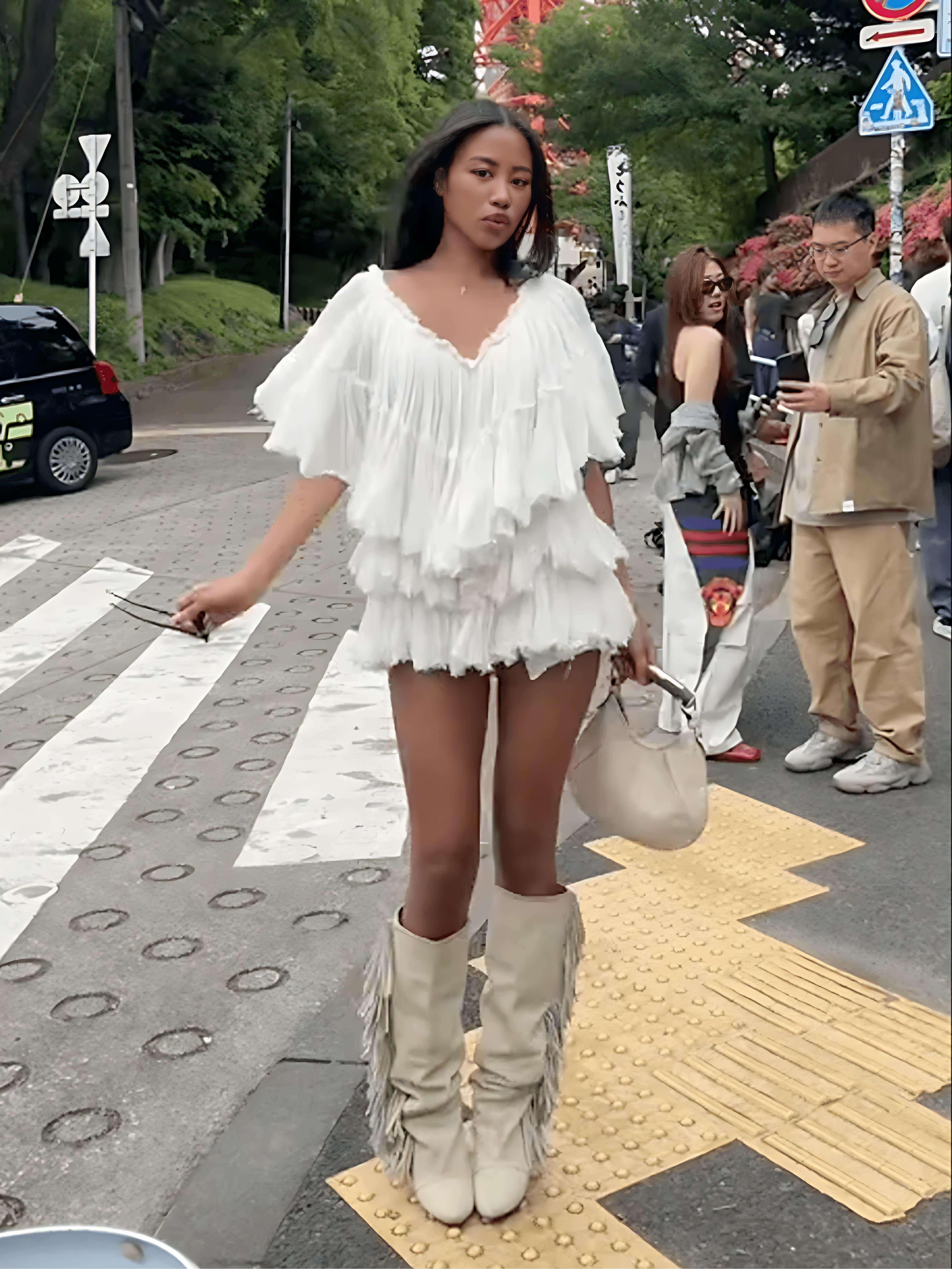 Playful and romantic. this pleated ruffled mini dress combines bohemian chic with street-chic edge. Soft ivory pleats and a flowing off-the-shoulder silhouette exude effortless femininity while remaining bold and casual.