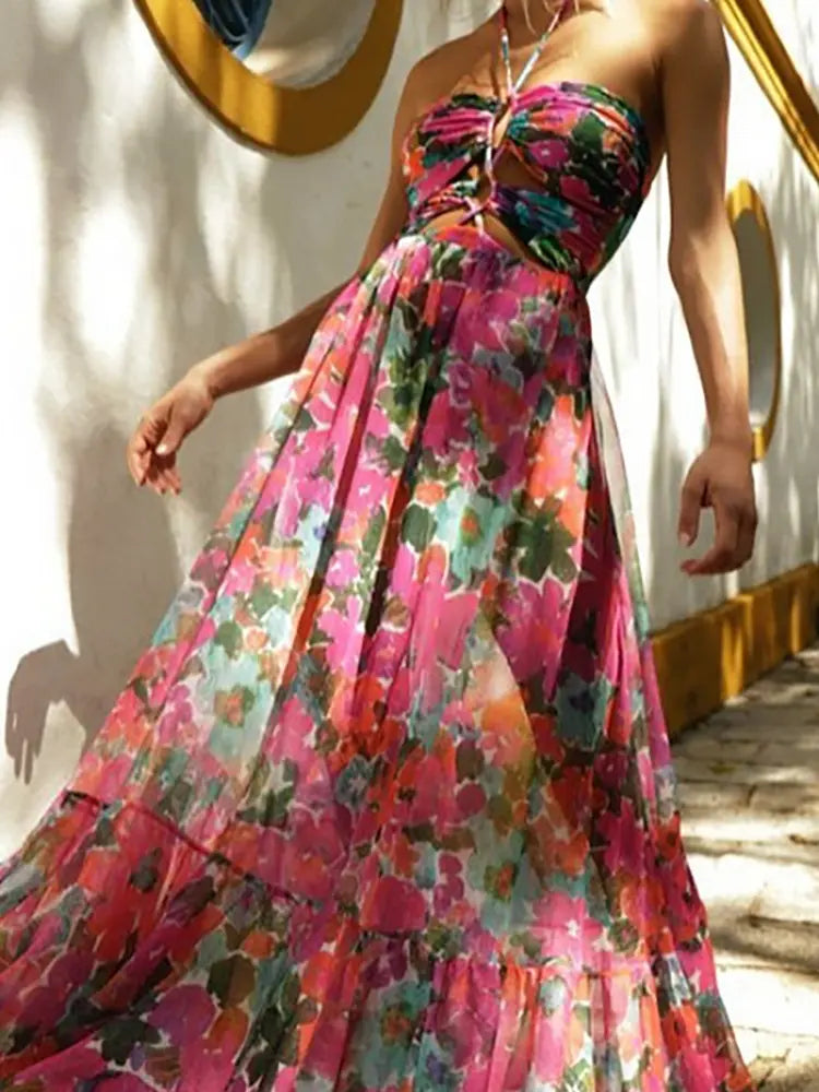 Lively pink print with cutout accents two styles: halter with drawstring and spaghetti strap version soft. sculpting stretch fabric offers comfort and a flattering fit playful yet elegant design for varied styling.